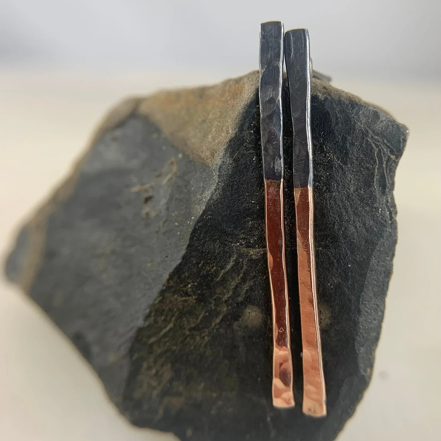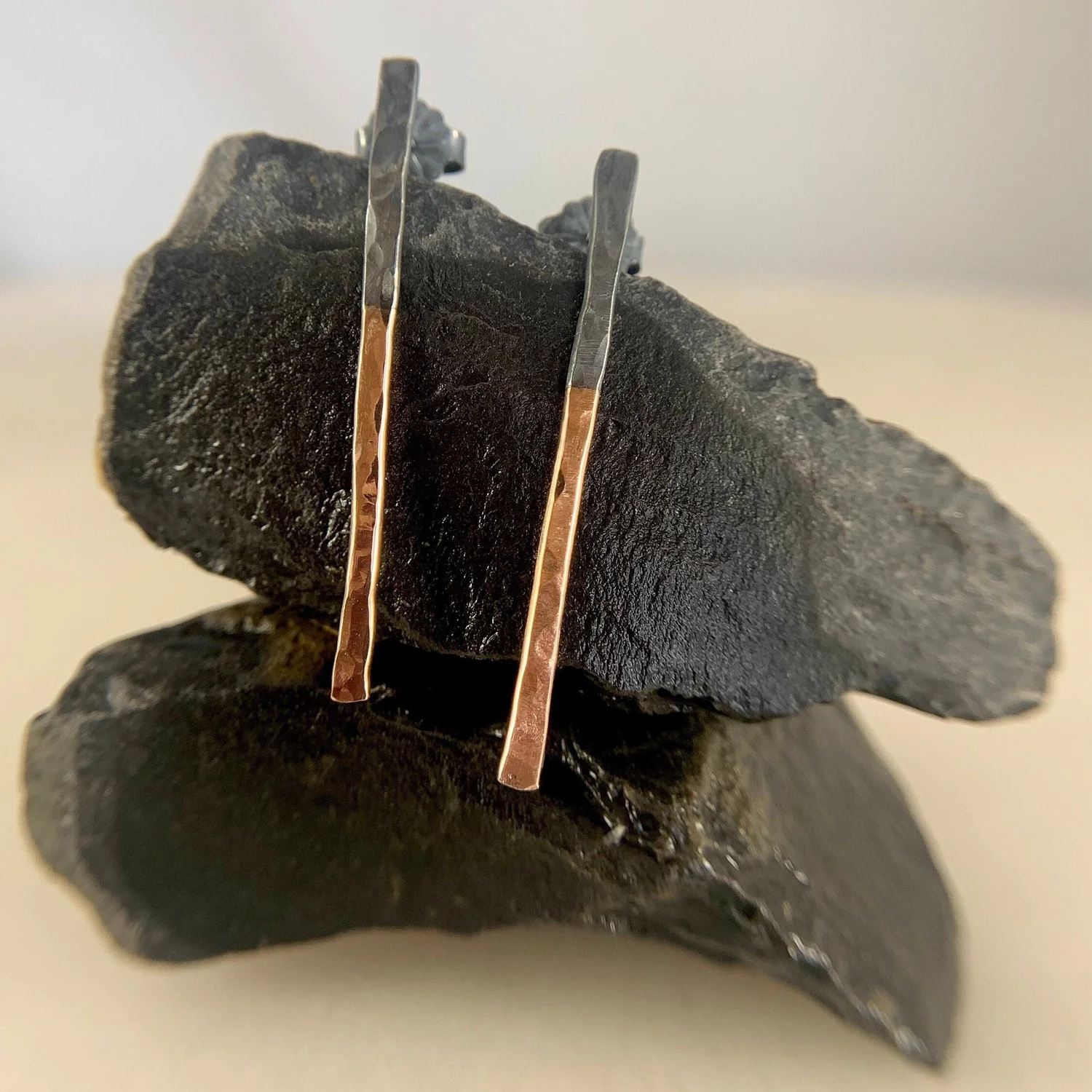Solid 14K rose gold and oxidized silver.